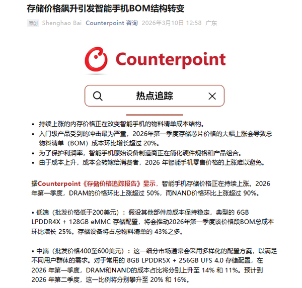 【CNMO科技消息】3月10日在线股票配资查询门户,市场研究机构Counterpoint最新发布的《存储价格追踪报告》显示,持续上涨的内存价格正在深刻改变智能手机的物料清单(BOM)成本结构,并对不同层级的手机市场产生差异化冲击。入门级产品受此影响尤为严重。